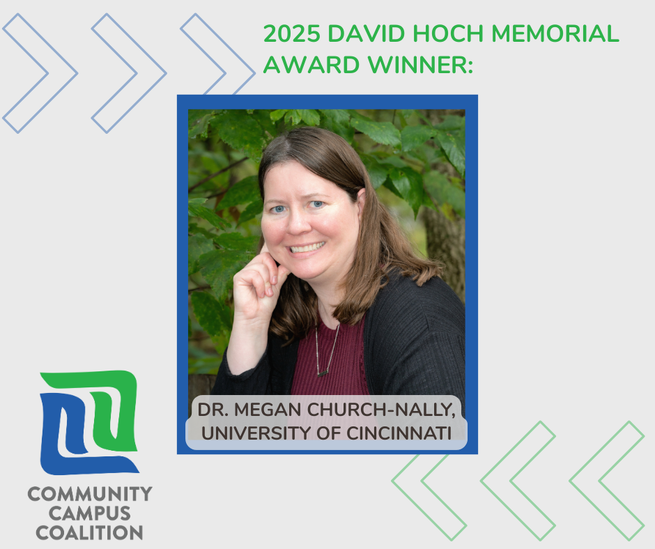 The David Hoch Memorial Award for Excellence in Service is designed to recognize and honor faculty and staff at Triple C campus partner institutions for their outstanding work in service-learning, community engagement, and civic engagement.
