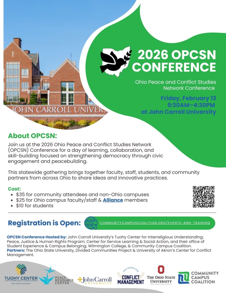 Triple C is proud to co-host the 2026 Ohio Peace and Conflict Studies Network (OPCSN) Conference on Friday, February 13, 9:30AM–4:30PM at John Carroll University. This year’s theme, “Strengthening Democracy through Civic Engagement and Peacebuilding,” brings together Ohio colleges, universities, and community partners for a full day of learning, collaboration, and skill-building.